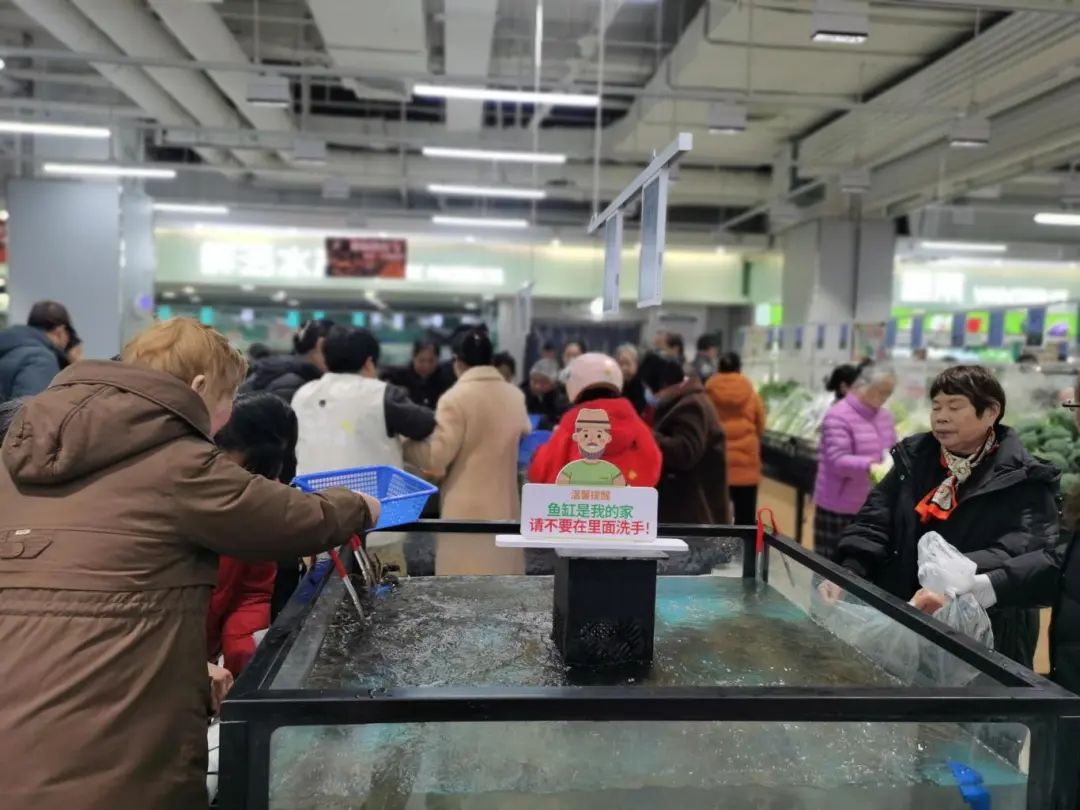 步入门店,生鲜区成为冬日消费的核心阵地,腌腊商品鲜香扑鼻,三炸系列品种丰富,浓郁的现场“烟火气”扑面而来。熟食区引入现场即食、蒸煮烤炸类多元商品,烘焙区面包经营面积同步扩容。火锅专区内,鲜切牛羊肉、火锅冻品、净菜与底料整齐码放,水产区活鱼虾蟹鲜活肥美,全方位满足市民暖冬涮肉与滋补养生的双重需求。